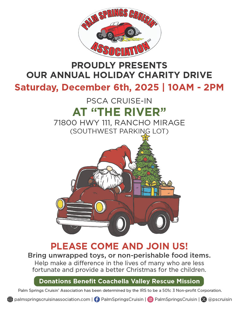 HOLIDAY CRUISE-IN & TOY DRIVE ( THE RIVER IN RANCHO MIRAGE )THIS CRUISE-IN CAR SHOW IS A FUND RAISER FOR THE COACHELLA VALLEY RESCUE MISSION. BRING AN UNWRAPPED TOY OR NON-PERISHABLE FOOD ITEMS TO DONATE. FUN FOR THE WHOLE FAMILY! COOL CLASSIC CARS AND TRUCKS, MUSIC, KID'S CONTESTS AND MORE. DECEMBER 6, 2025 10AM-2PM. FOR MORE INFORMATION VISIT US AT WWW.PALMSPRINGSCRUISINASSOCIATION.COM | ||